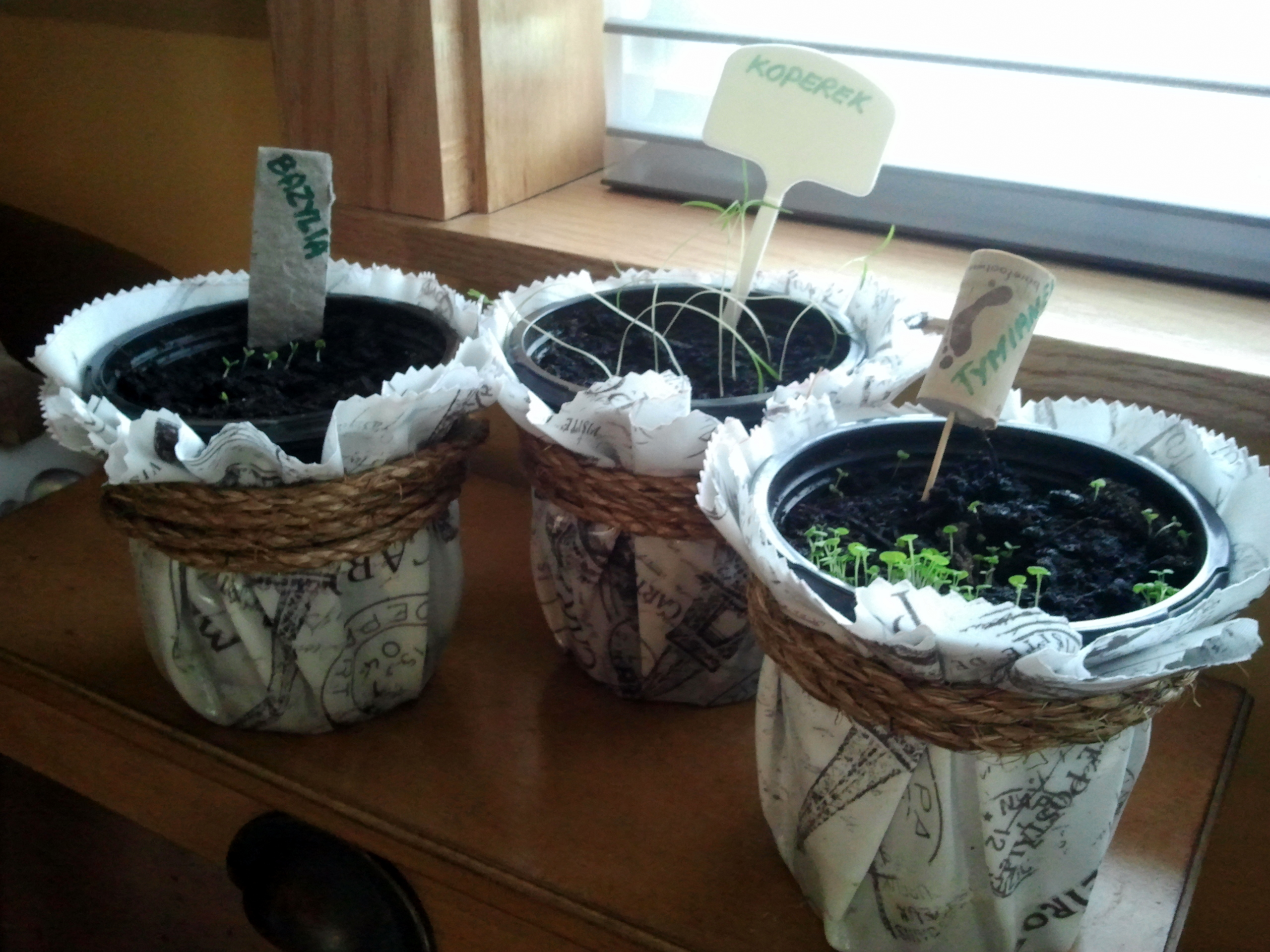 Zaczęły wreszcie wystawać z ziemi. Pielęgnuję je na parapecie juz nie pierwszy raz. Jednak każdy koperek zawsze „zdziczał”. Nie mam pojęcia dlaczego? Tym razem zostawiłam tylko kilka jego roślinek w doniczce. A może on sie po prostu nie nadaje na parapet? Nie mogłam już patrzeć na nagie, czarne doniczki i owinęlam je ceratą i sznurkiem. Na pewno wspomoże utrzymaniu wilgoci, a i nie przemoknie. W każdej kuchni powinny być bukiety swieżych ziól. Pewnie w końcu wyniose je do ogródka, no ale nie wszyscy go mamy.