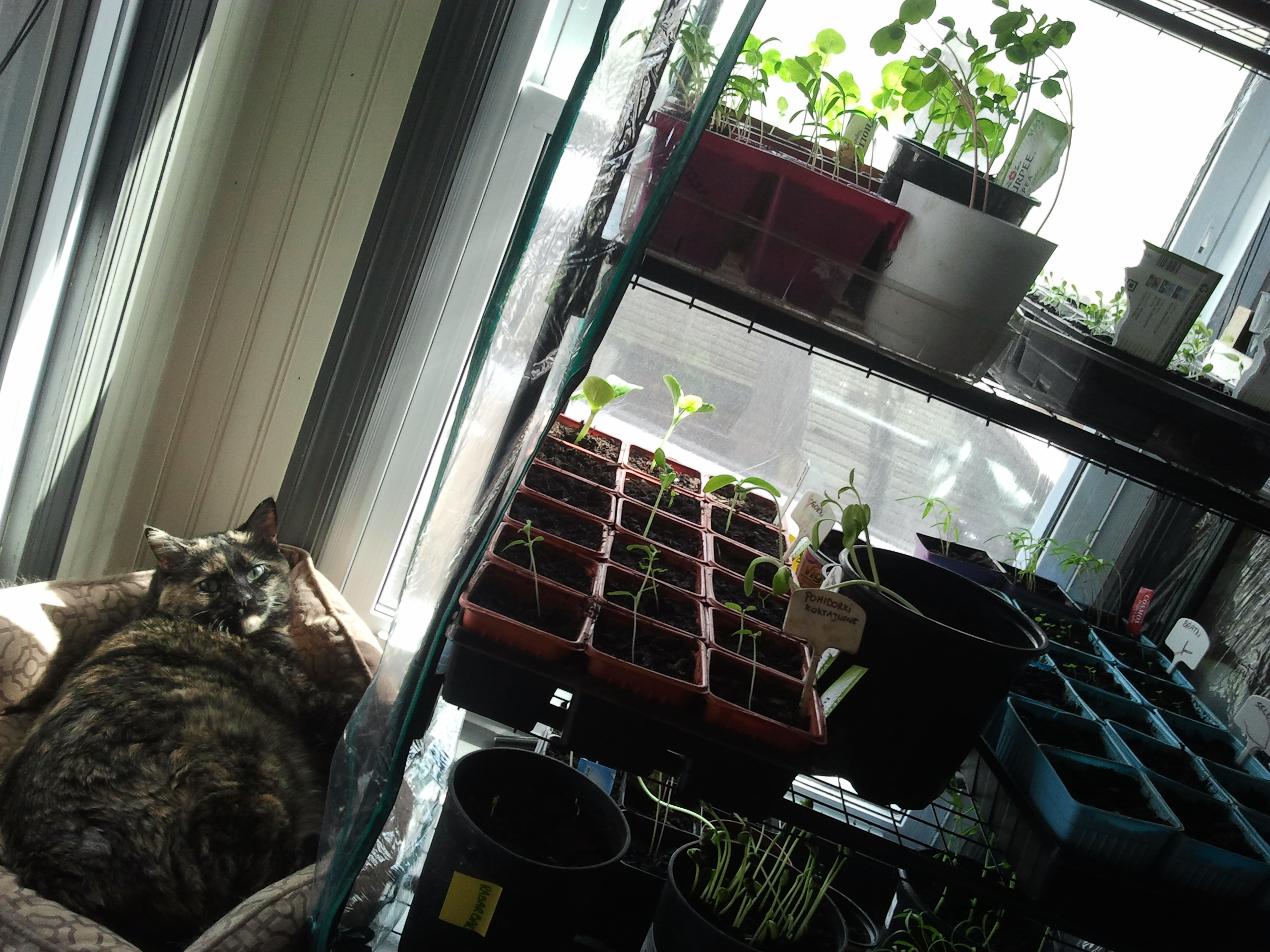 Ta kupa sierści obok to Xena. Wygrzewa sie w promieniach słońca razem z roślinkami. Pogoda zapowiada sie ładna, wiec niedługo zaczne hartować je na dworze. Moje pierwsze nasionka marchewki i pietruszki, które posiałam w klatce chroniącej przed wiewiórami, zostały wypłukane przez ostatnie ulewy/zalania. Ale kiełkuja juz następne. Nie zwlekaj, posiej i ty. Czas też na wkładanie do ziemi lub donic kwiatów wieloletnich, które przetrzymywaliśmy w domu na okres zimy. Można również śmialo sadzić cebulki.