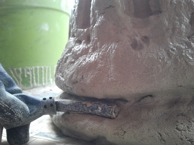 Pobawiłam się dzisiaj przez chwilę. W garażu męża znalazłam worek cementu. W wiaderku rozrobiłam go z wodą w proporcji mniej więcej 4:1. Najperw wlałam troszke wody i dosypując cementu stale mieszałam, starając się uzyskać konsystencję papki, tak abym mogła szpachelką oblożyć nią zwykłą doniczkę. Zaprawę rozprowadziłam po zewnętrznej stronie donicy. Później nałożyłam na nią plastikowy worek i wygładziłam ją w miarę możliwości. Starą końcówką kabla wyciskałam wzorek. W jej spodzie zostawiłam kawałeczek kredy, żeby była drożna przy podlewaniu. Zasychała dobre 2 godziny. Ale w pierwszej godzinie dobrze jest ja nawilżać zwykłą wodą, żeby nie popękała.