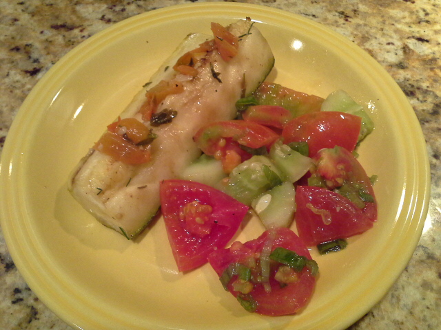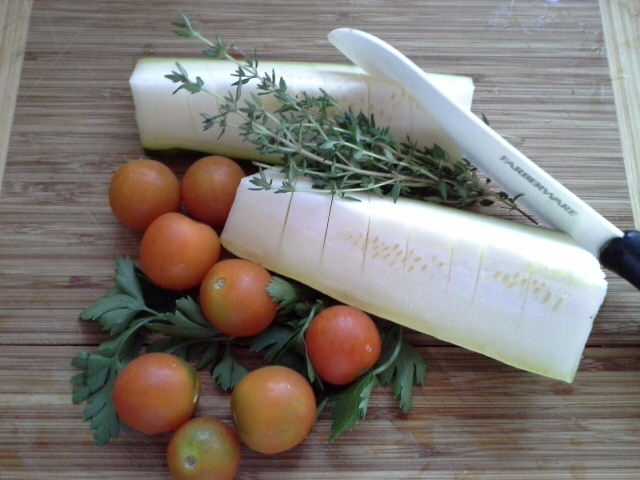 W tym roku polubilam grilowanie. Kiedyś wszystko przyrządzałam za długo na ogniu. Co w rezultacie było suche i uwędzone. Mam tylko 2 krzaki cukini, ale dobrze podlewane dają dorodne owoce każdego dnia. W misce wymieszałam w oliwie z oliwek pocięte pomidorki koktajlowe ze swieżym tymiankiem, natką pietruszki, rozgniecionymi ząbkami czosnku, solą i pieprzem. Cukinię pociełam w paski nacinając gęsto jej miąższ. Ułożyłam w tym cukinię skórka do wierzchu i zostawiłam w lodówce na 2 godziny, żeby nasiąkła. Grilowałam ją na kaźdej stronie po kilka minut. Po wylożeniu jej na talerz można po jej wierzchu posmarować delikatnie używaną marynatą. Pyszna!