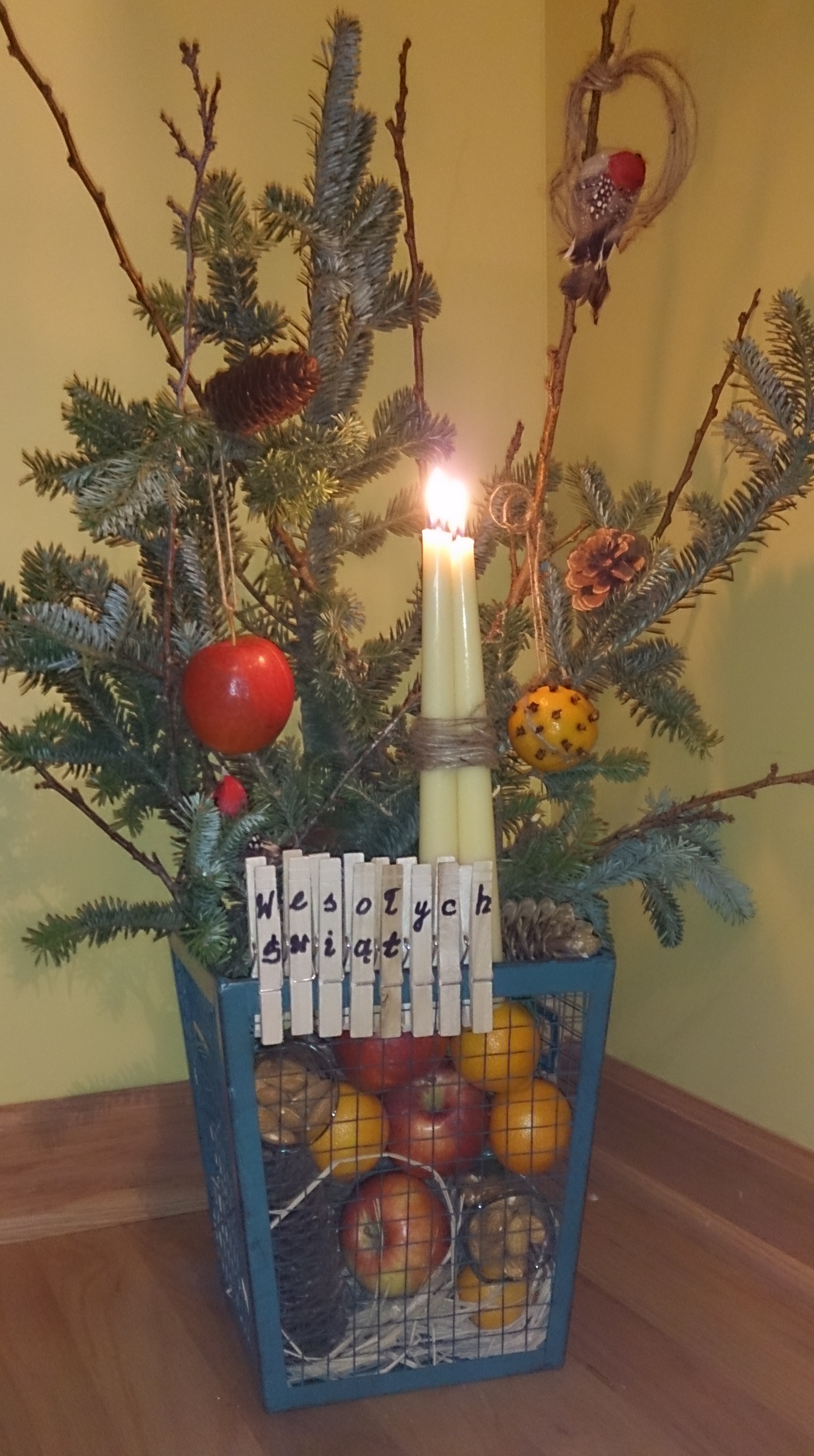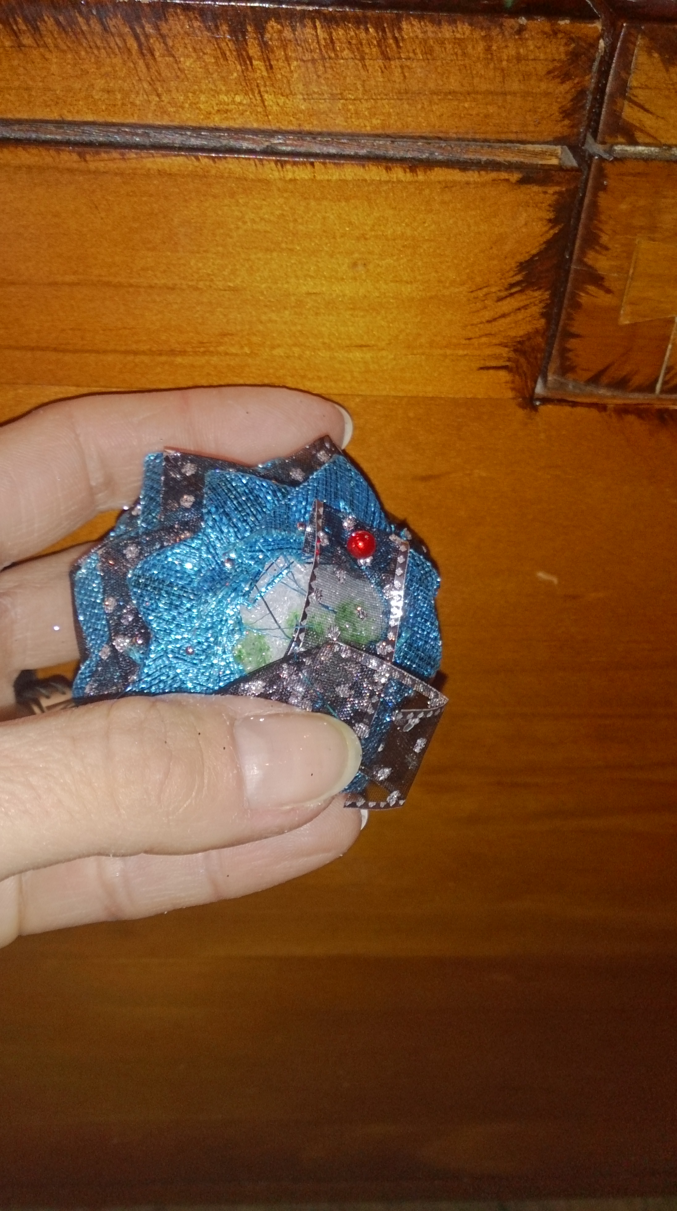 Takim projektem zainspirowała mnie Ewa. Troszkę pracochłonny, ale jakże przyjemny. W miejscu, gdzie krzyżują się tasiemki, wbijamy ozdobną szpilkę. Tniemy lamówkę na fragmenty. Długość nie może być krótsza niż szerokość lamówki przemnożona razy dwa. Zaginamy narożniki, aby powstał trójkąt.