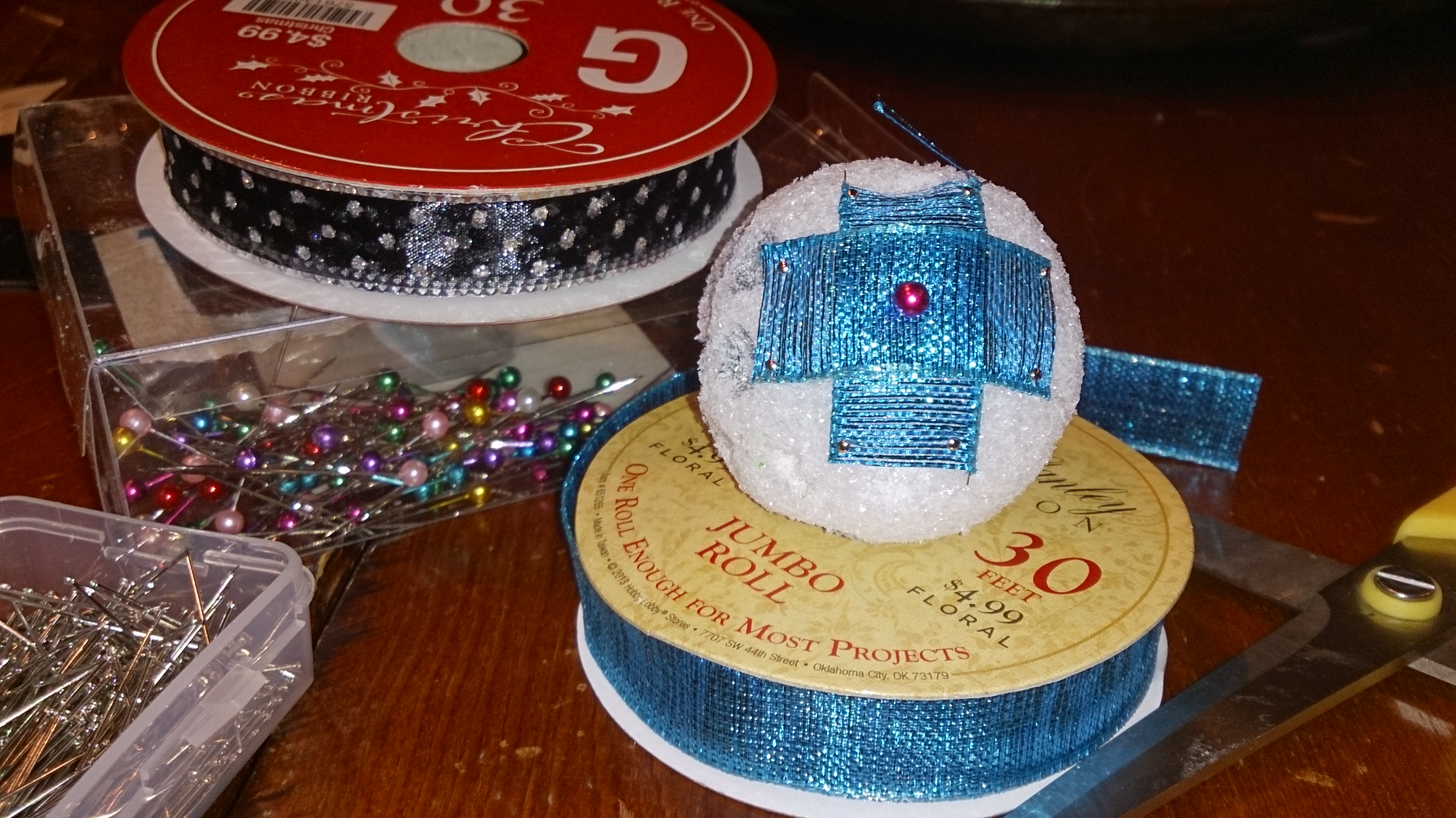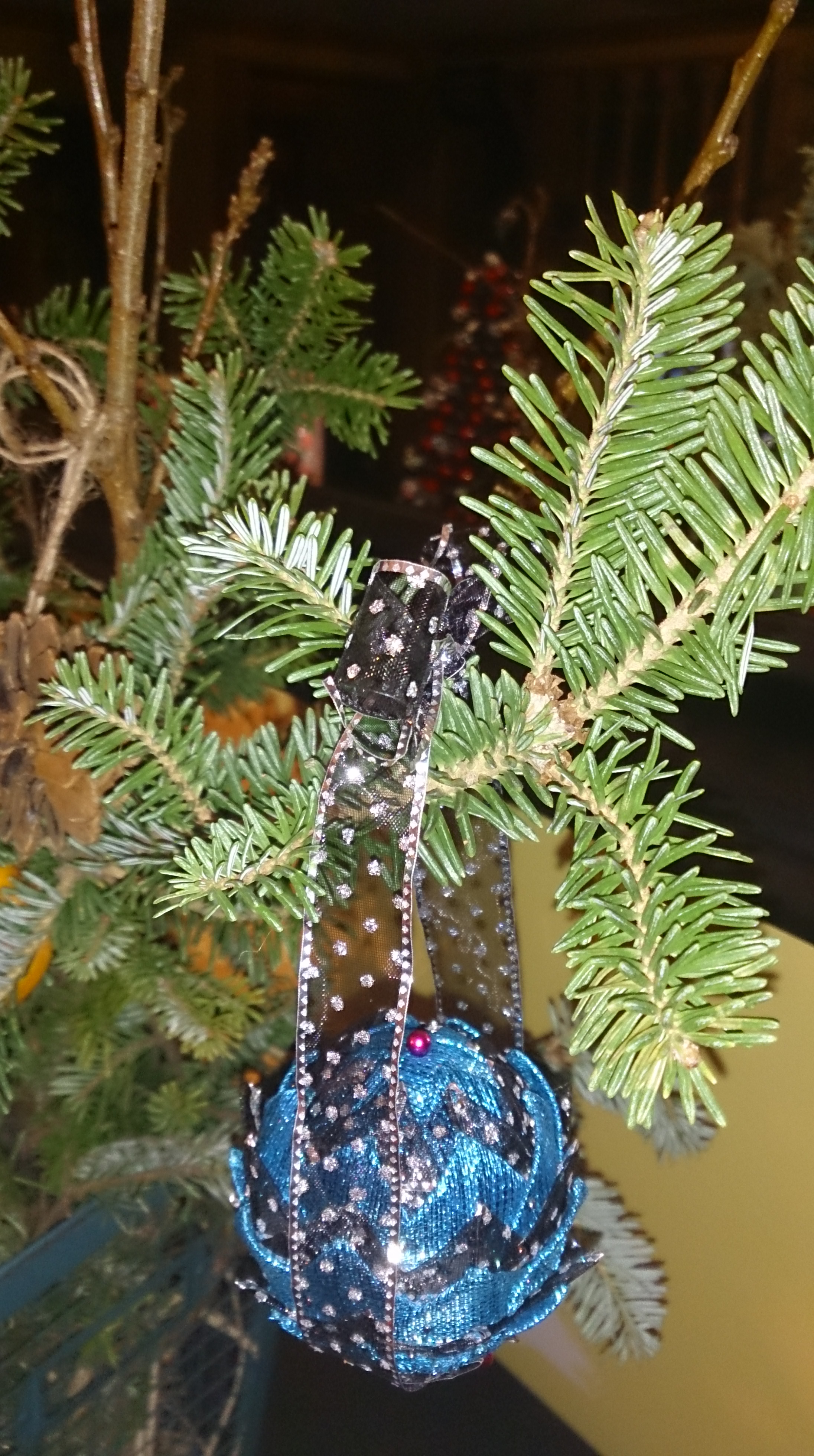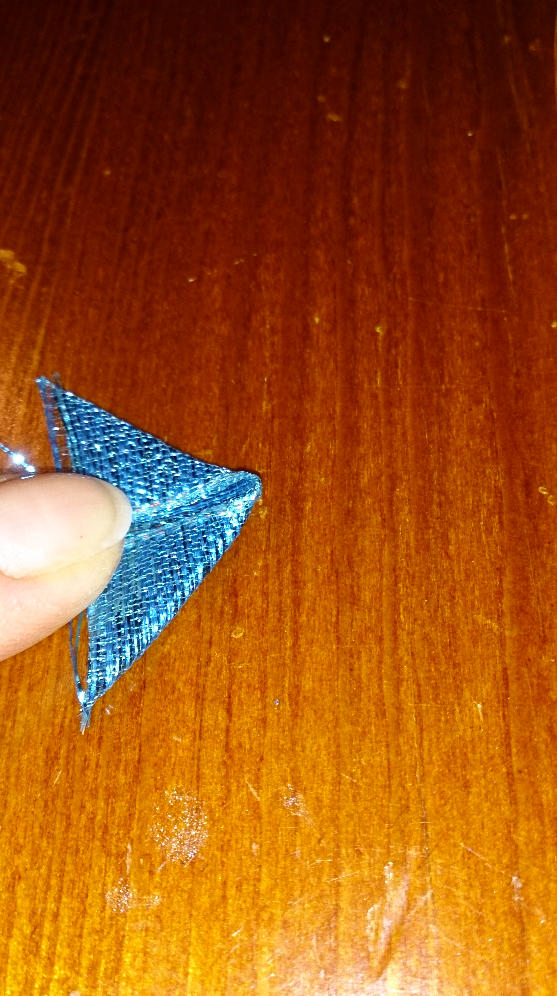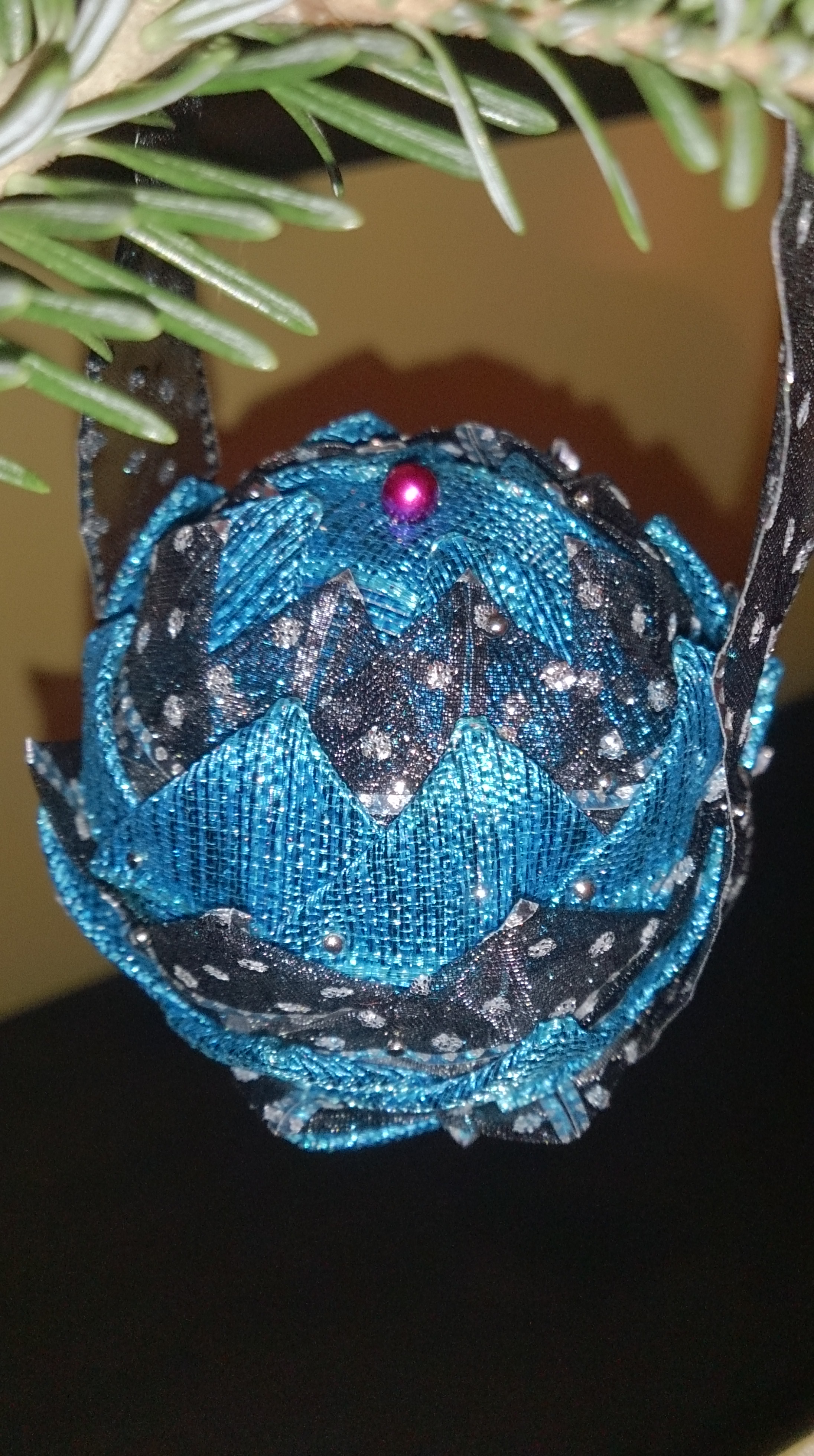 Brzegi trójkąta powinny być wygładzone. Mocujemy je najpierw naprzeciw siebie za pomocą zwykłych szpilek. Później mocujemy kolejne obok. Powinno ich być 8 w rzędzie. Kolejny rząd wykonujemy w innym kolorze. Itd. Wierzchołek trójkąta powinien samoistnie przylegać do bombki. Ale to zależy od wybranej do projektu tasiemki. Szpilkami podpina się tylko dolne rogi trójkąta.